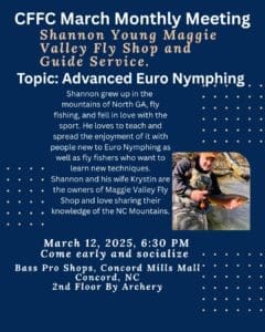 Shannon Young, owner of Maggie Valley Fly Shop and fly fishing guide, will be our guest speaker at our meeting this month.